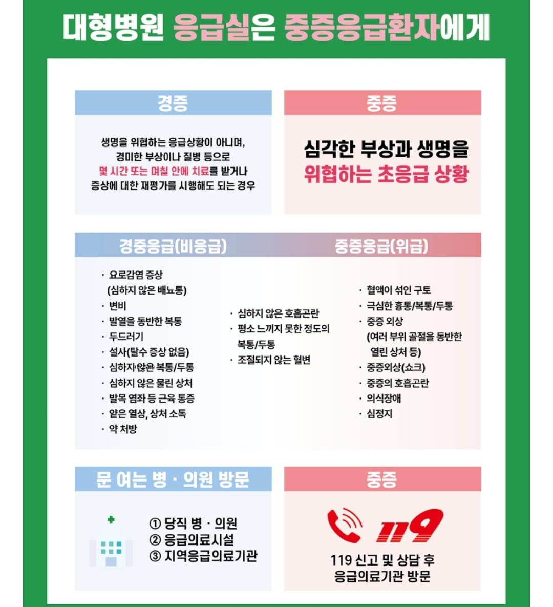 • 중증질환 의심 시: 병원 진찰 결과에 따라 큰 병원으로 이송될 수 있습니다.