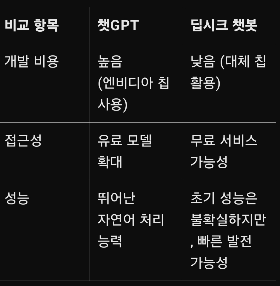 챗GPT가 AI 챗봇 시장을 선점하고 있지만, 딥시크 챗봇이 저렴한 비용으로 비슷한 성능을 제공할 수 있다면? AI 챗봇 시장의 경쟁은 더욱 치열해질 것입니다.